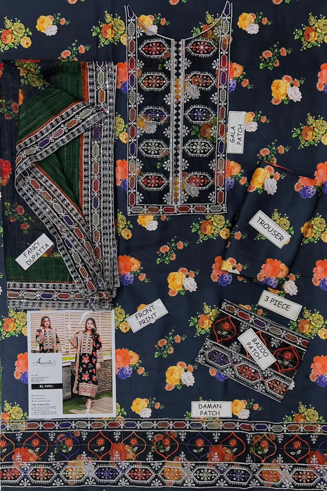 Bring elegance and luxury to your wardrobe with Aneela’s Original 3-Piece Silk Suit in a stunning Blue-Black shade. Crafted from premium Shamoz Silk, this unstitched outfit combines rich digital prints with exquisite embroidery for a timeless designer look.